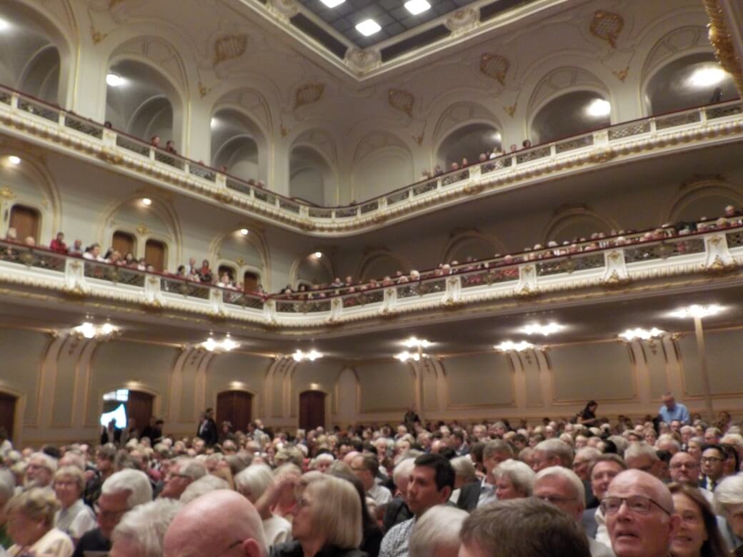 市内中心地ブラームス広場にある“Laeiszhalle”。2000人収容の大ホールは毎回満席となります。